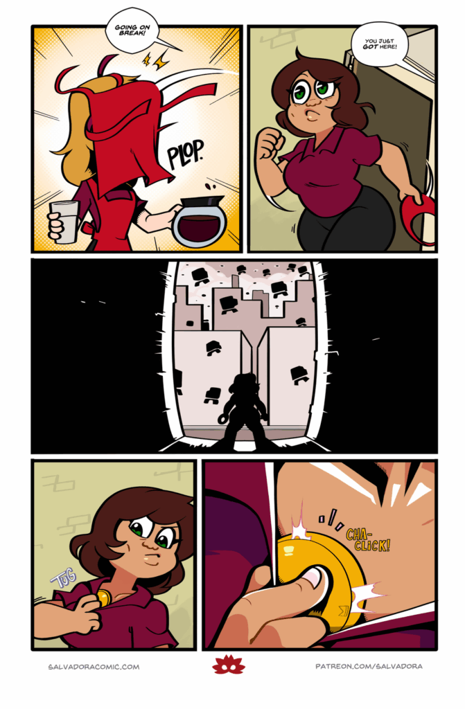 A fellow hero in trouble?! Check out this month’s new pinup only on Patreon! Here’s a sneak peek: Support Salvadora on Patreon to see the full pic! Buy our merch!
